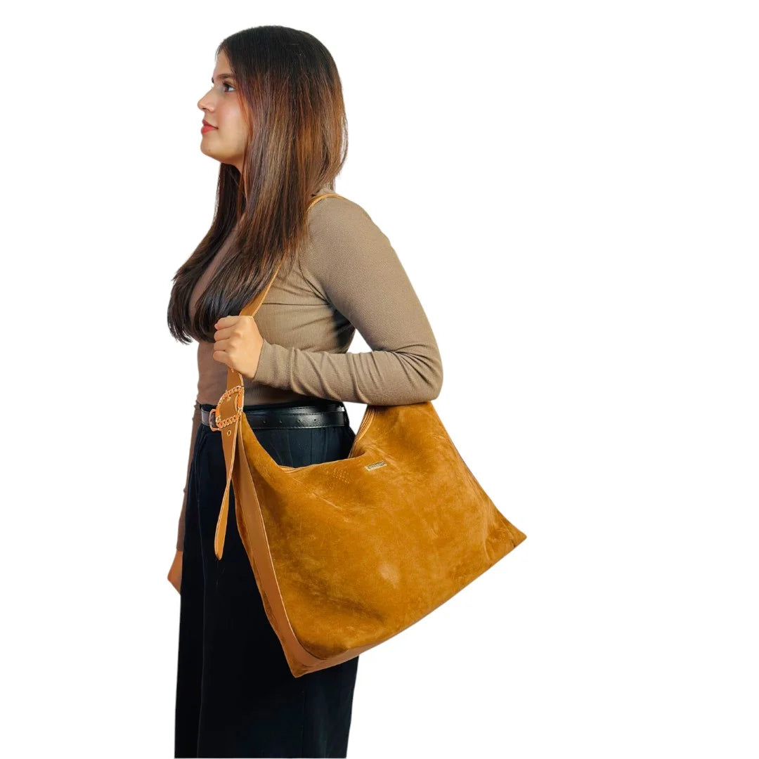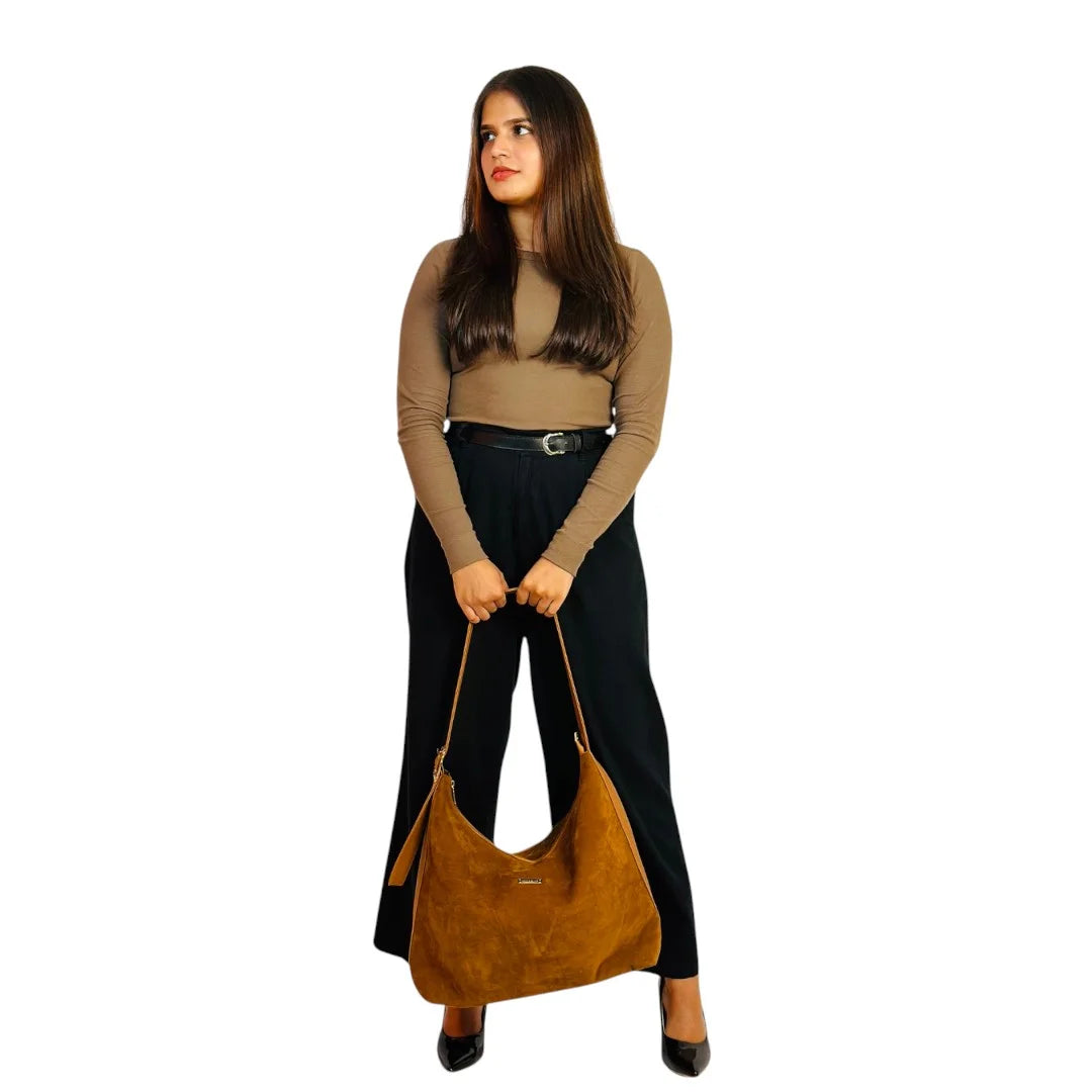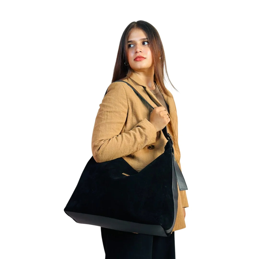 A softly structured suede tote designed with a relaxed silhouette and clean lines. Lightweight yet spacious, it offers an effortless blend of texture, comfort, and everyday elegance.