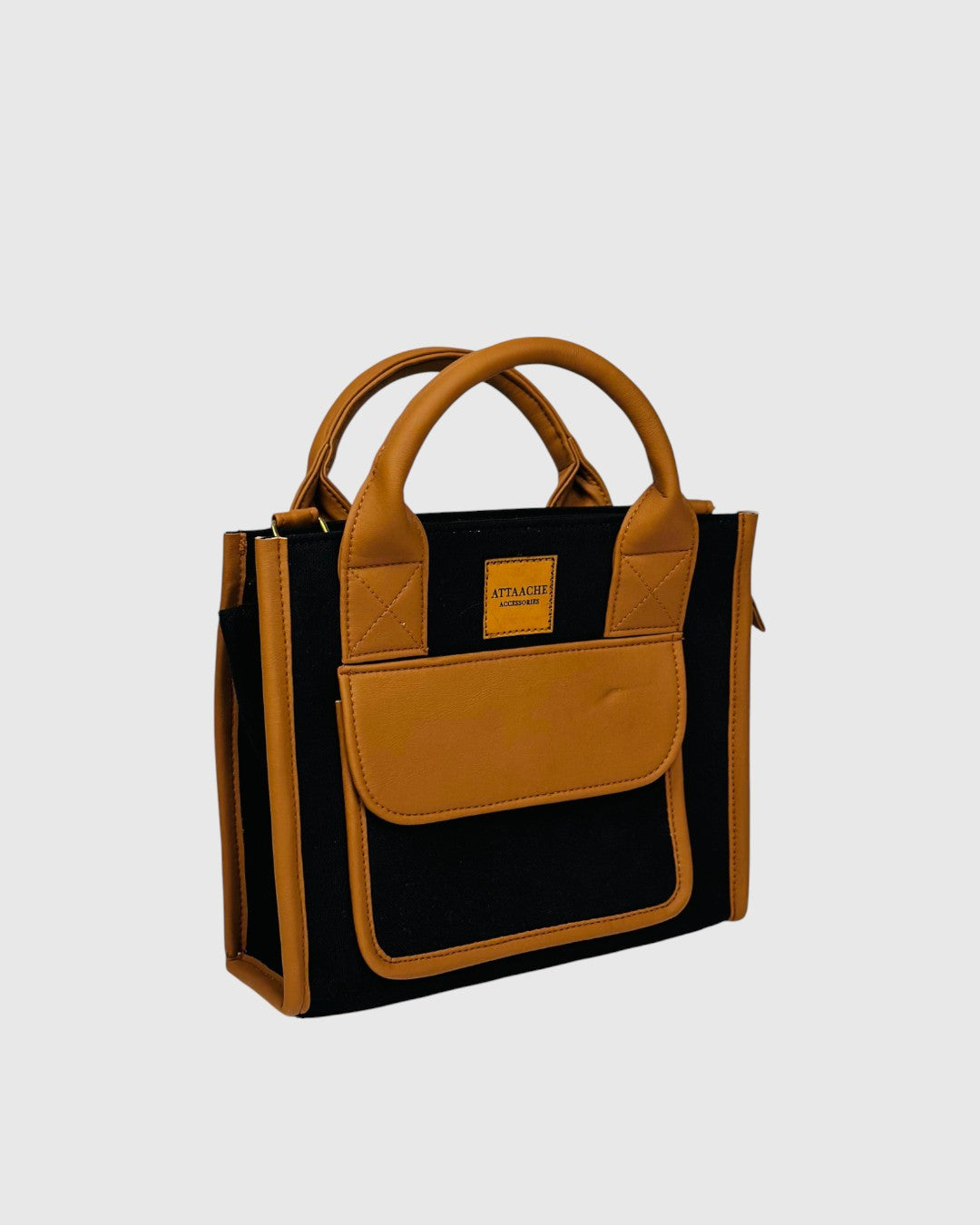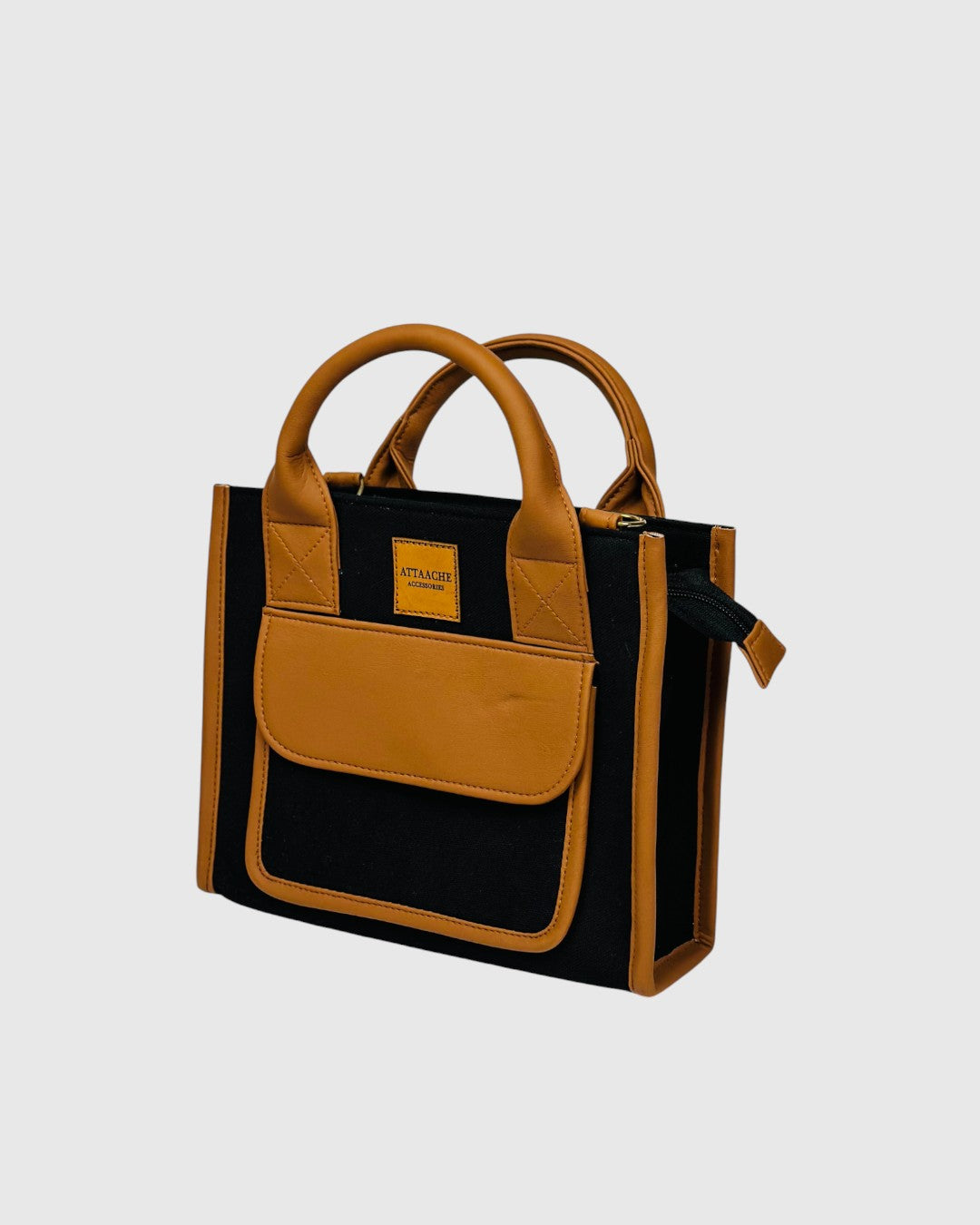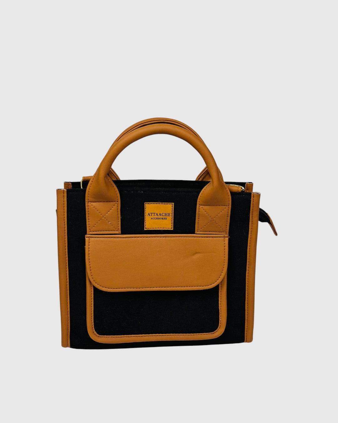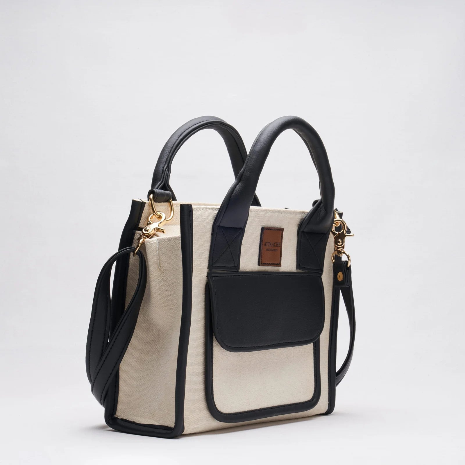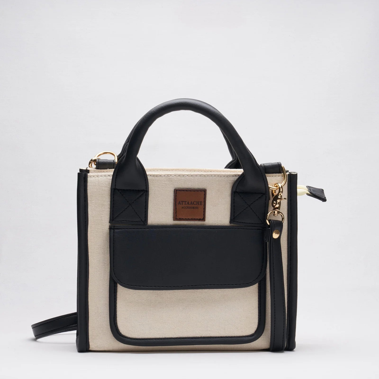 A structured everyday bag crafted with a durable canvas body and smooth vegan leather accents. Designed for functionality and clean aesthetics, it features a compact silhouette with practical pockets and versatile carry options.