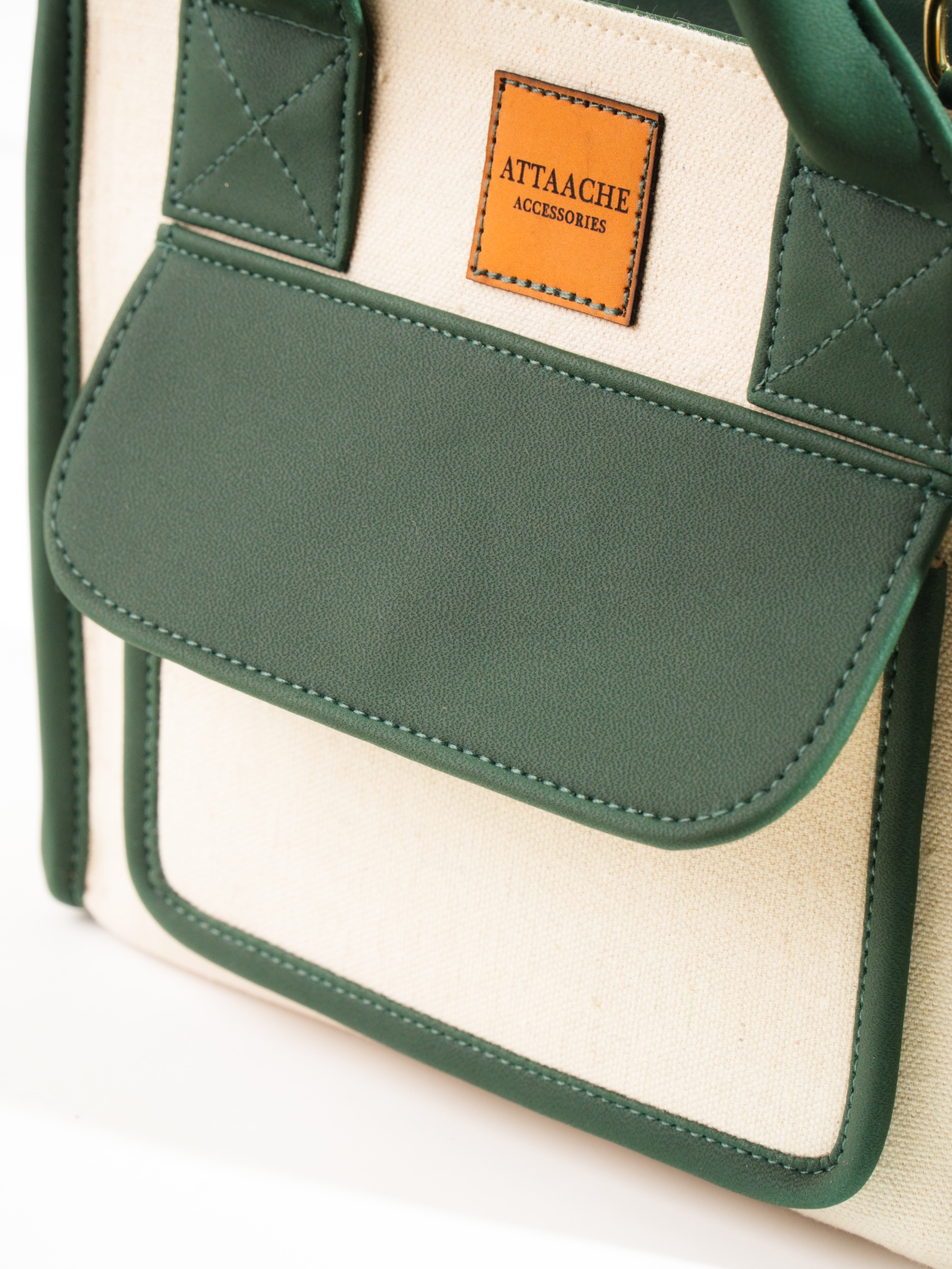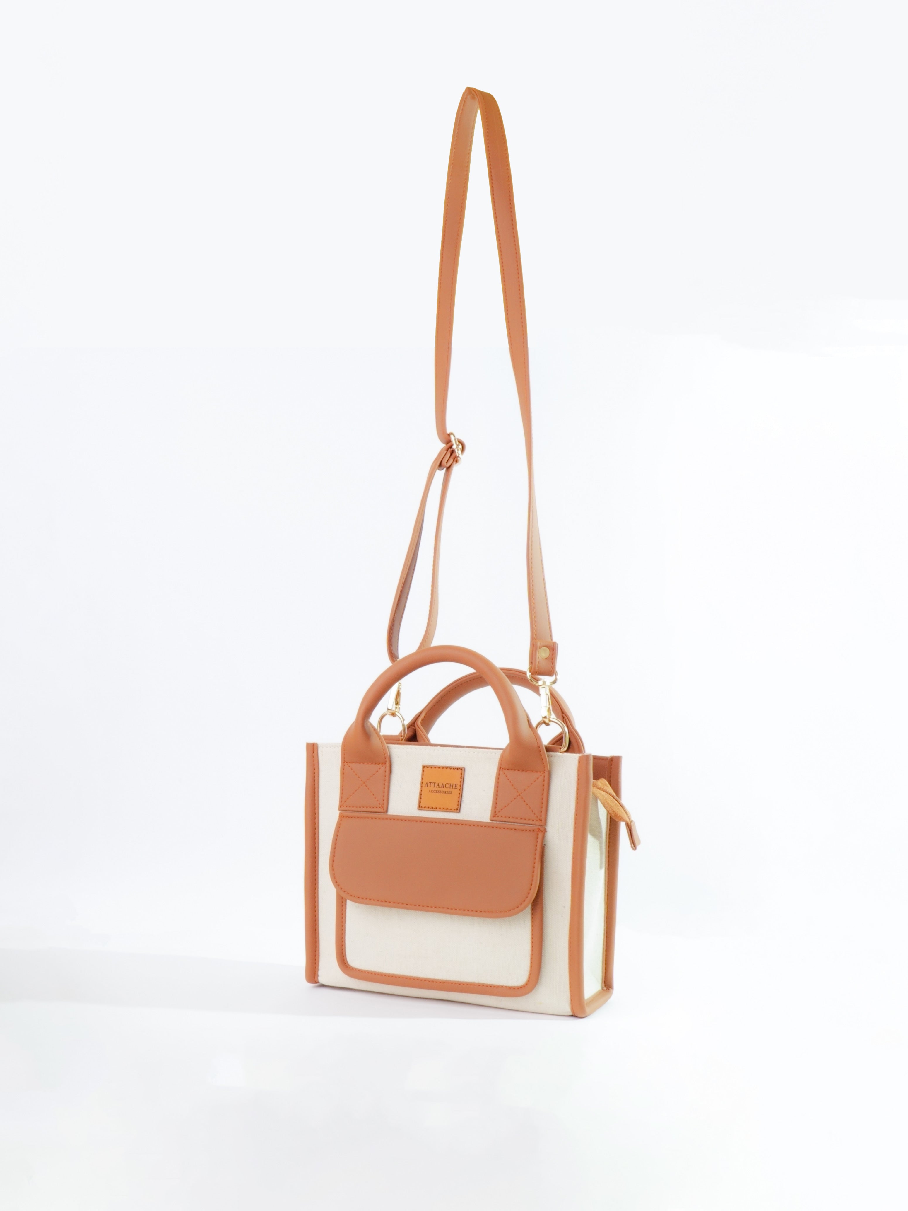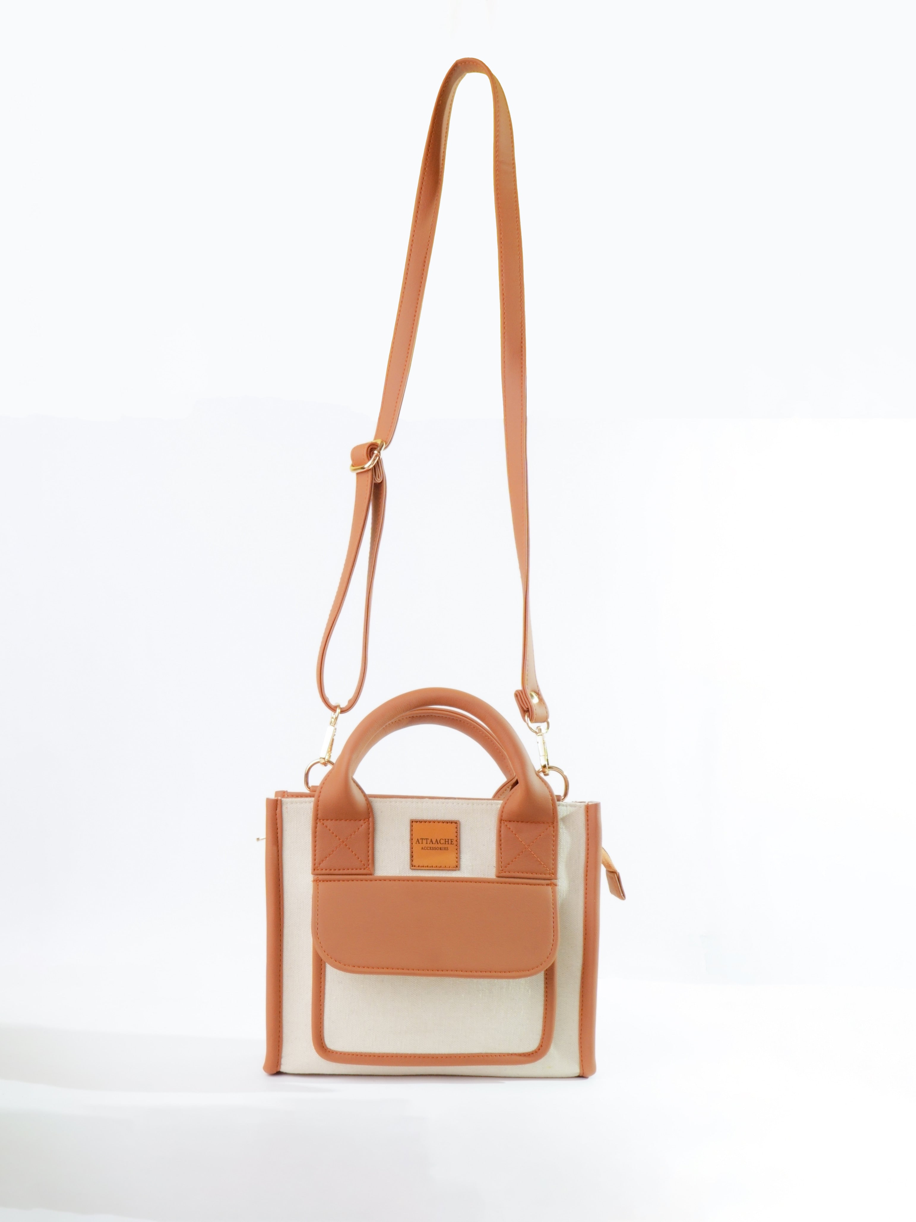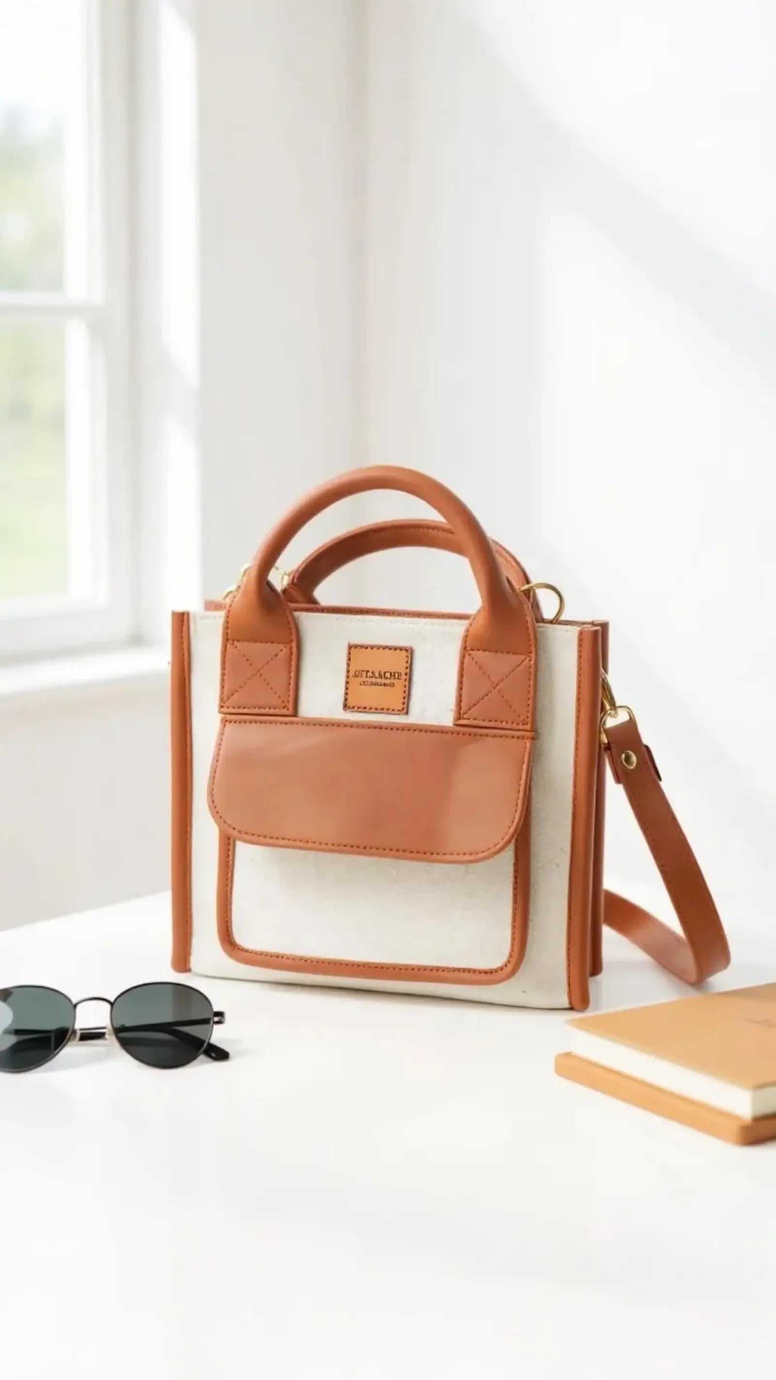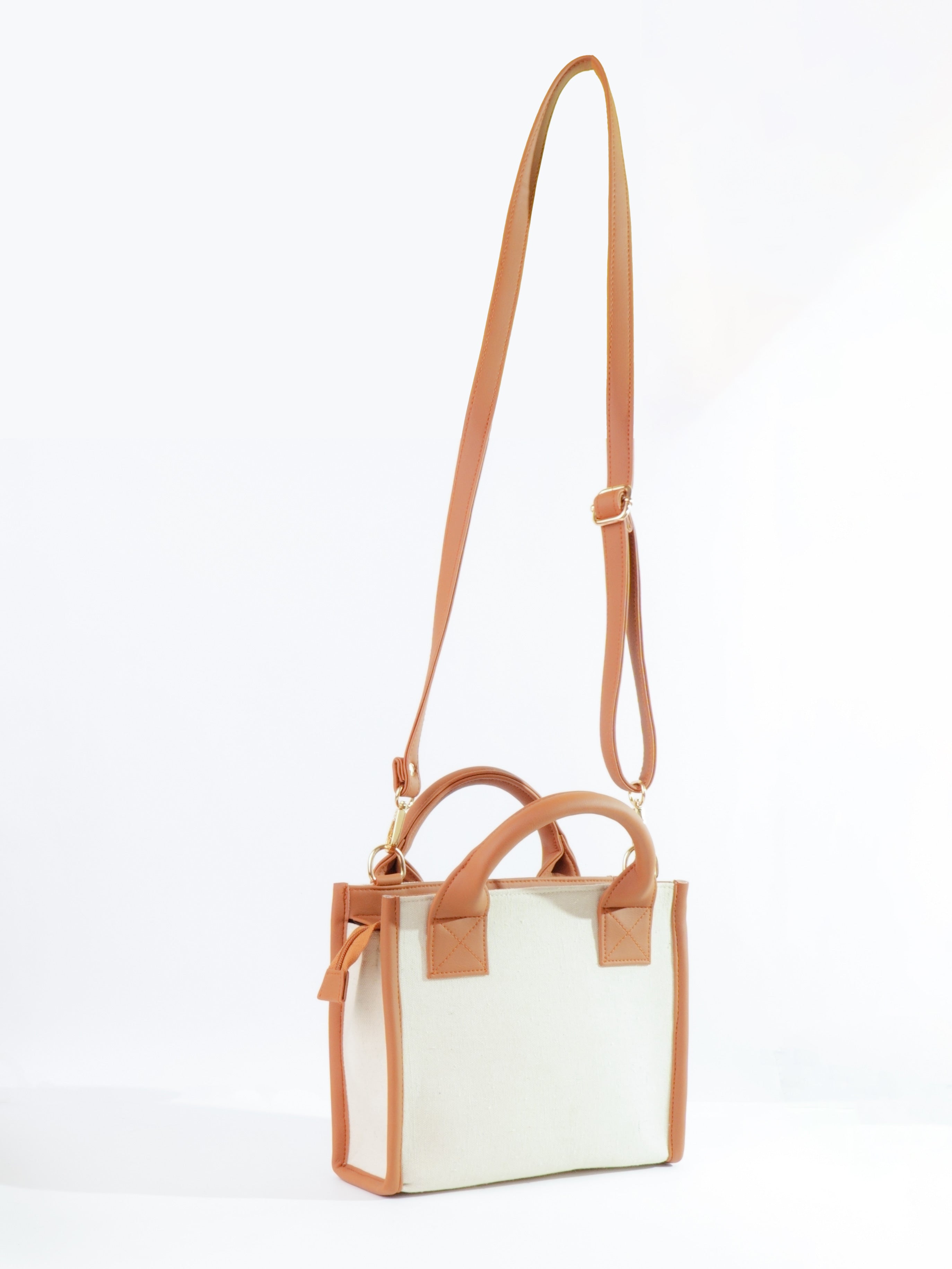 A structured everyday bag crafted with a durable canvas body and smooth vegan leather accents. Designed for functionality and clean aesthetics, it features a compact silhouette with practical pockets and versatile carry options.