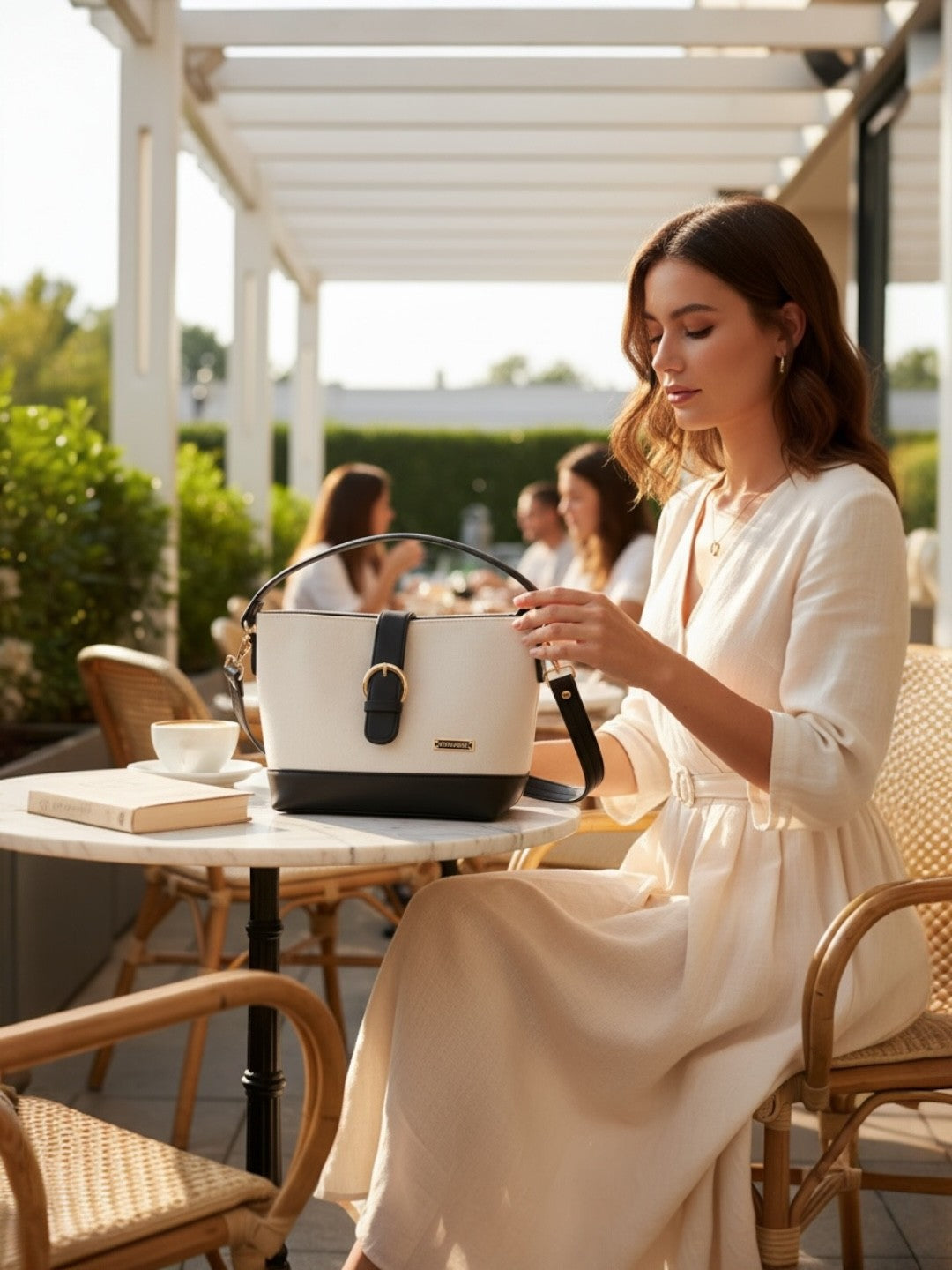 Pair with crisp shirts, denims, or dresses to highlight its clean shape