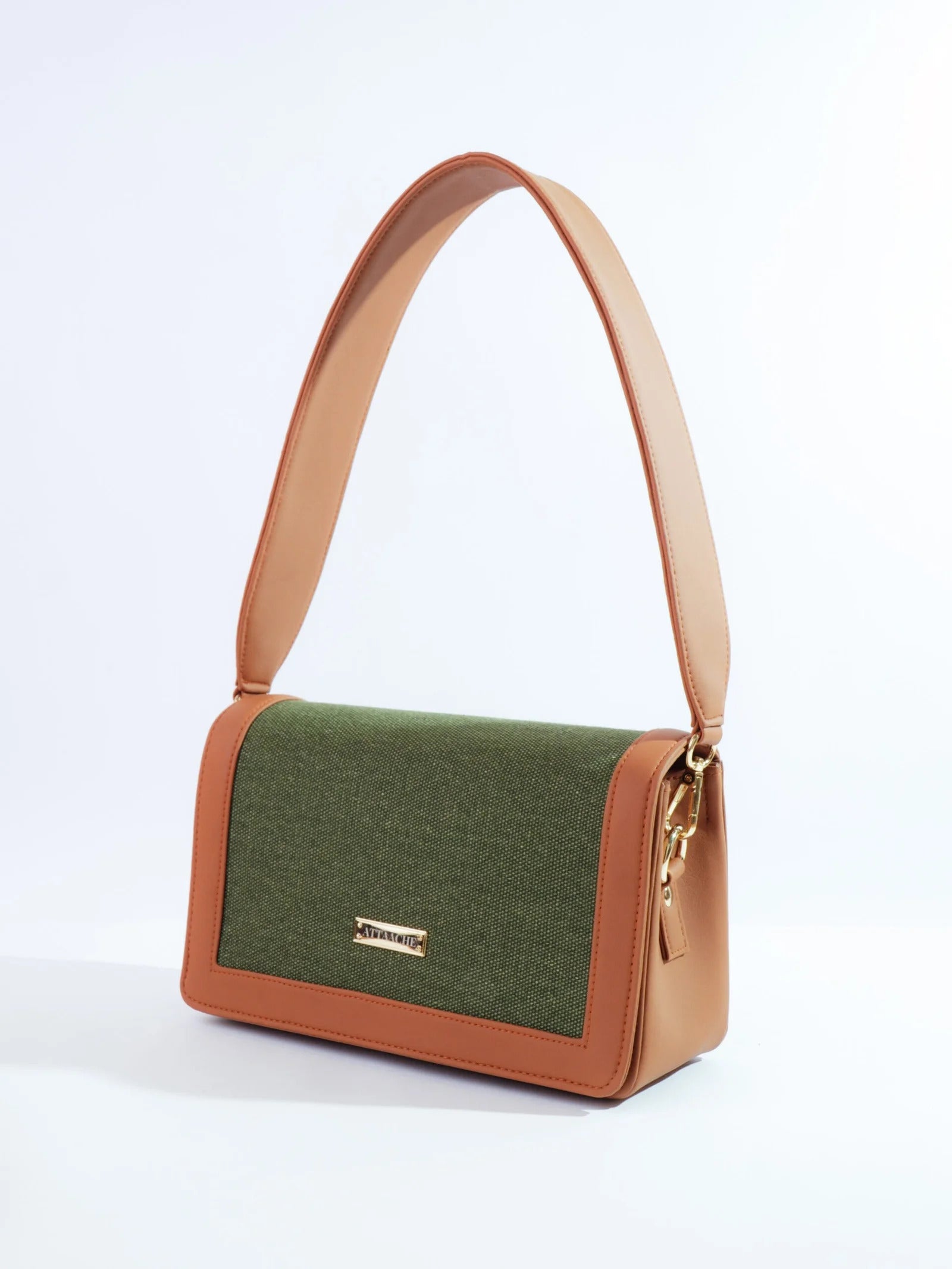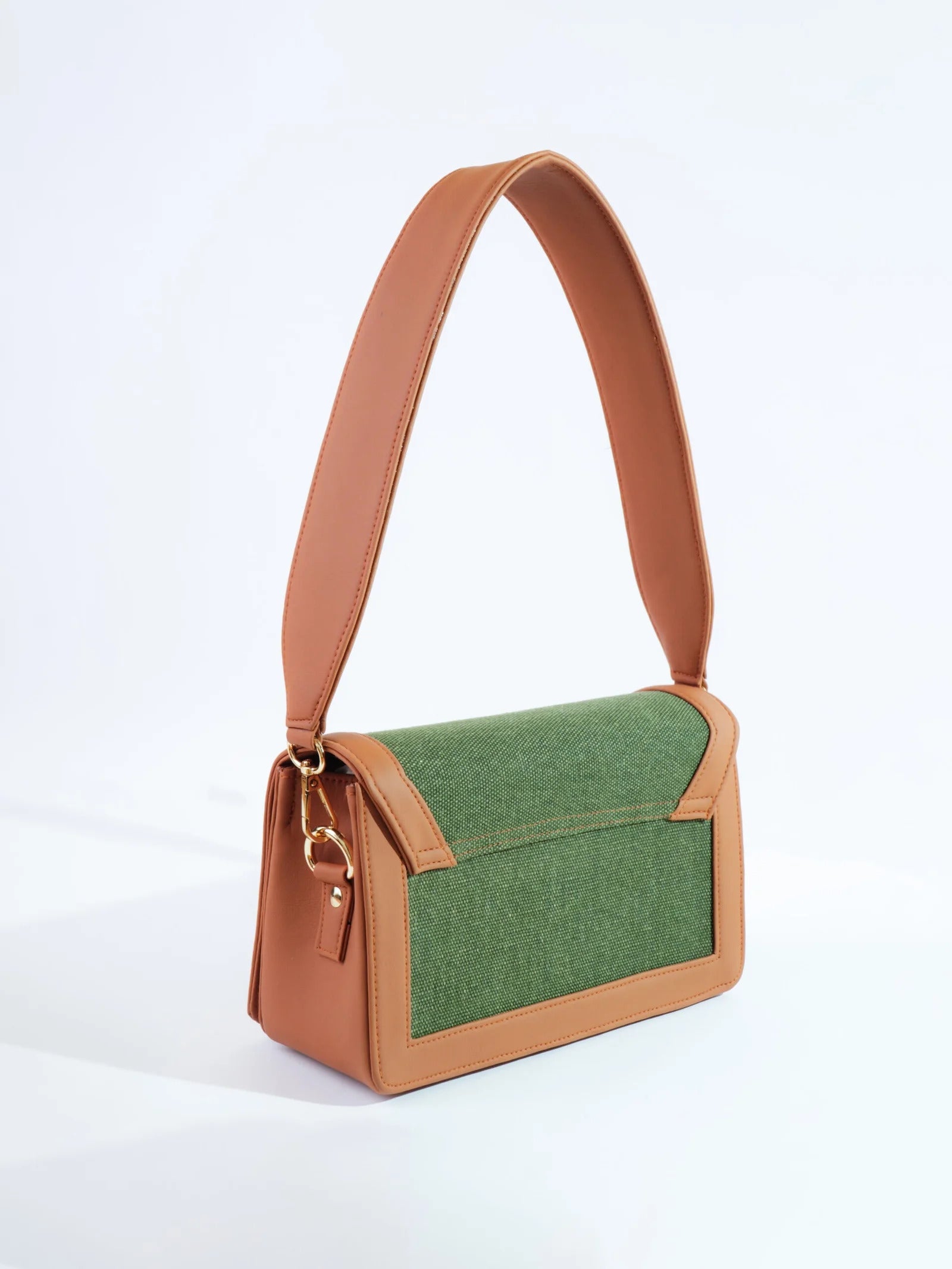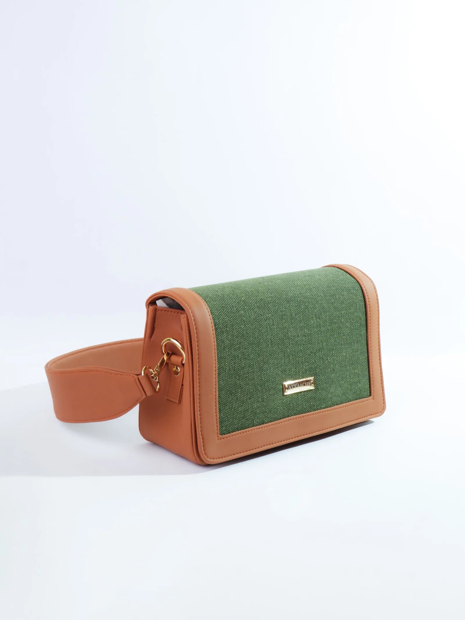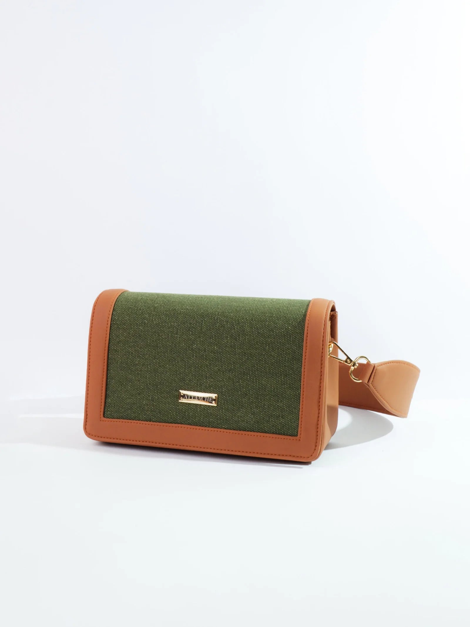 A structured shoulder bag defined by its bold, broad belt strap and clean rectangular form. The contrast of textured fabric and smooth trims gives it a refined yet modern presence.