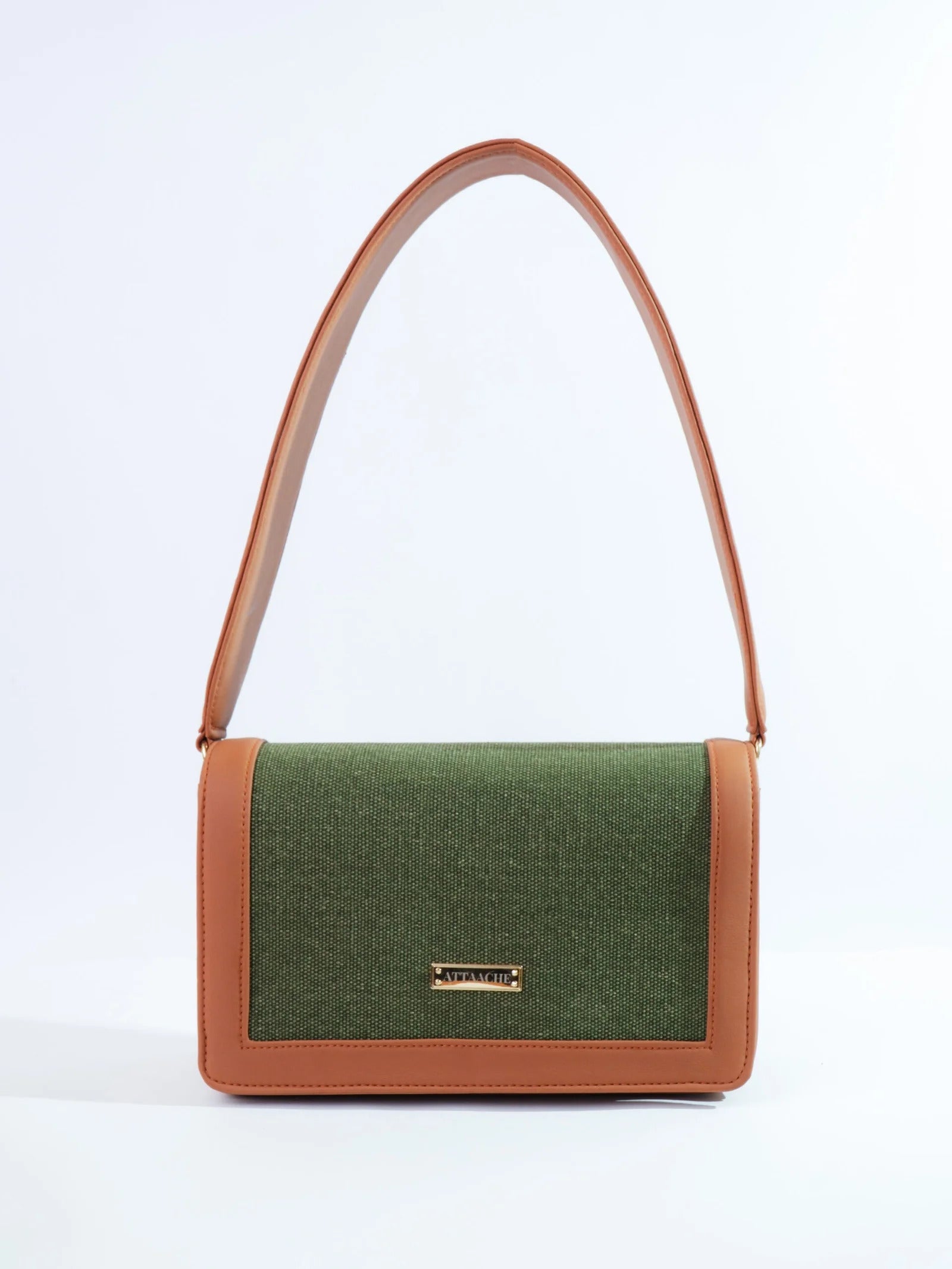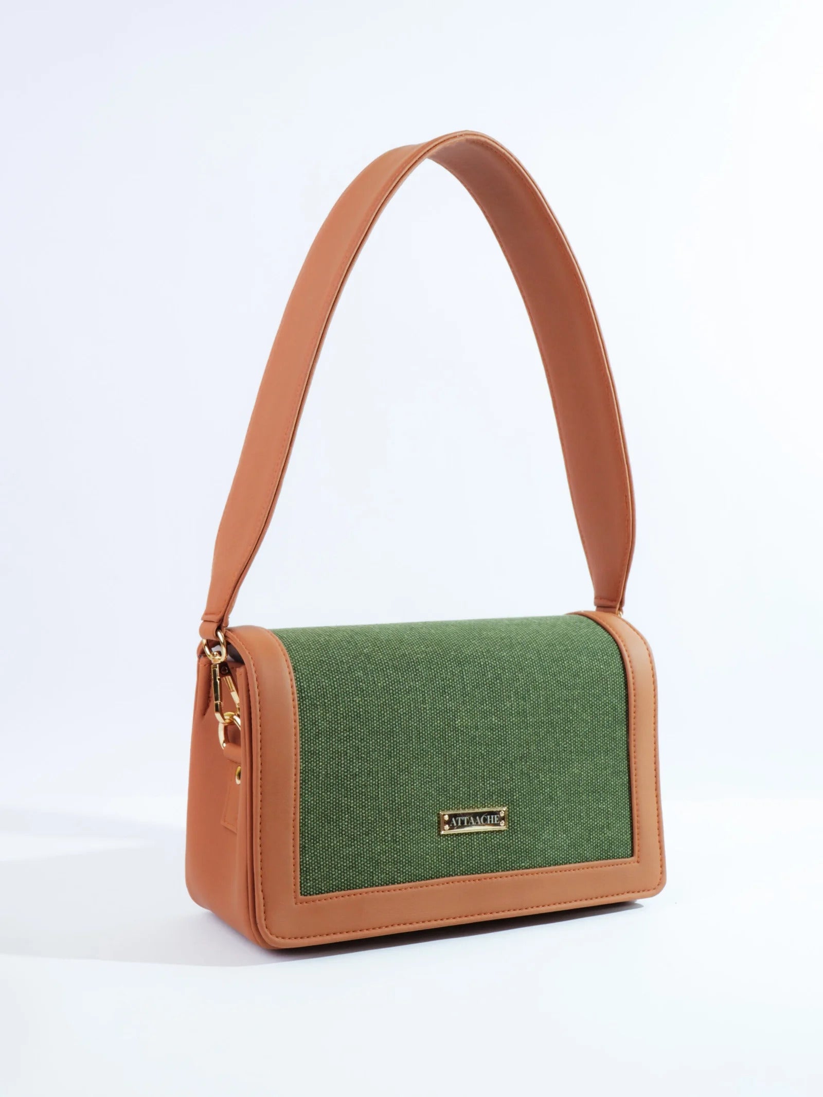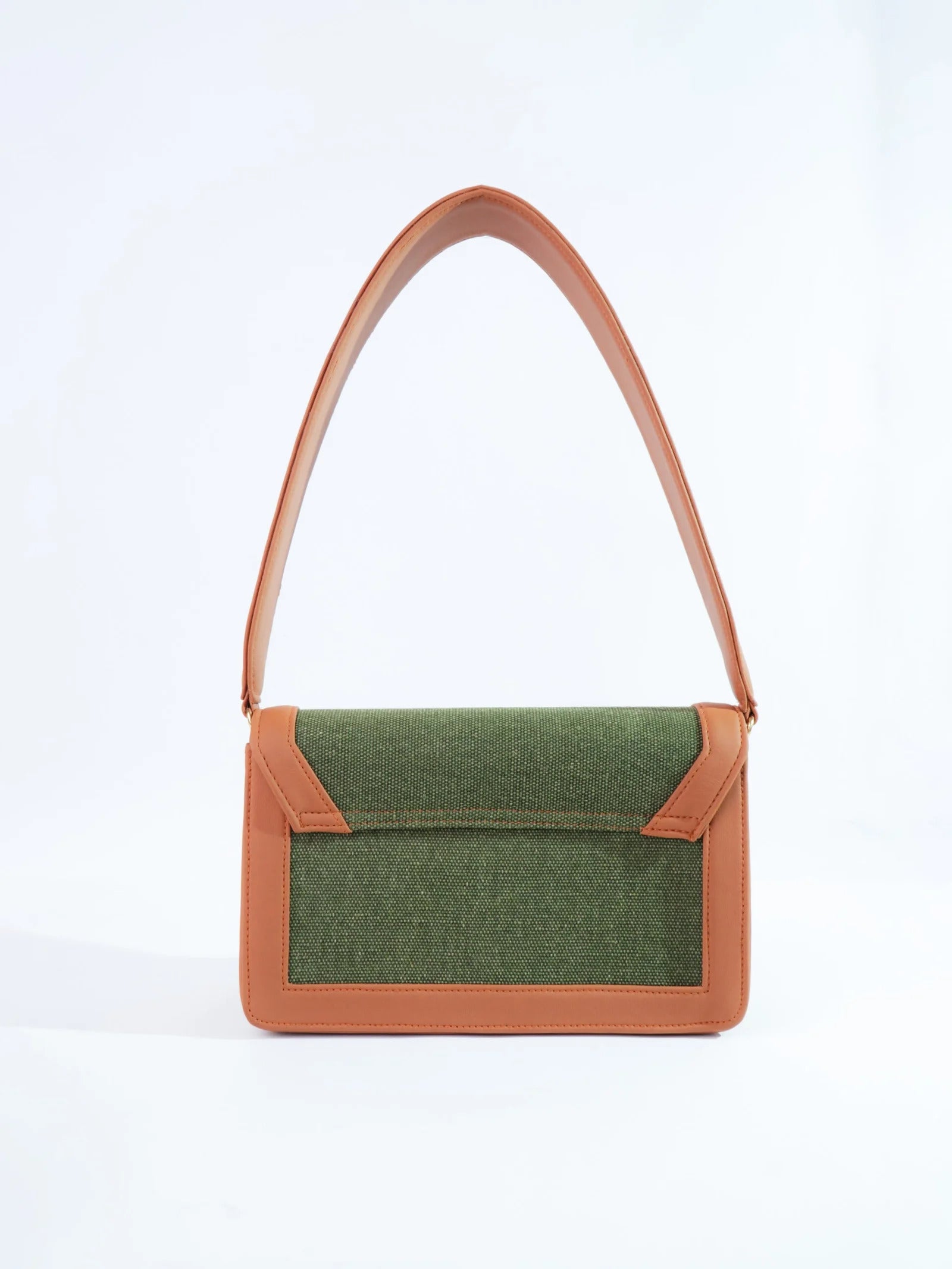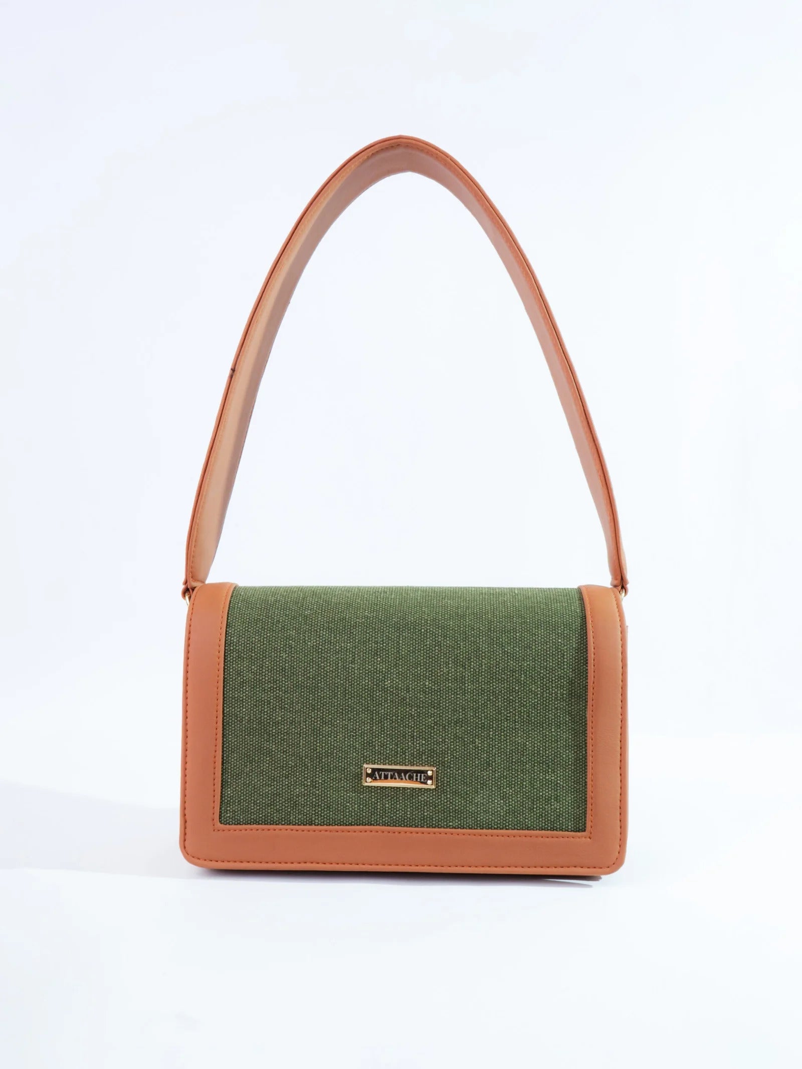 A structured shoulder bag defined by its bold, broad belt strap and clean rectangular form. The contrast of textured fabric and smooth trims gives it a refined yet modern presence.